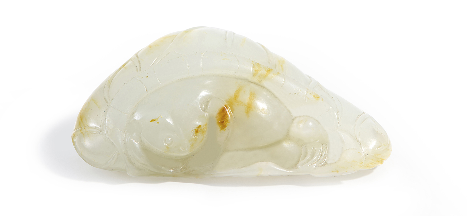 The jade of even pale celadon hue with russet inclusions, beautifully carved as a recumbent three legged toad within a curled lotus leaf, pierced to one side for use as a pendant.