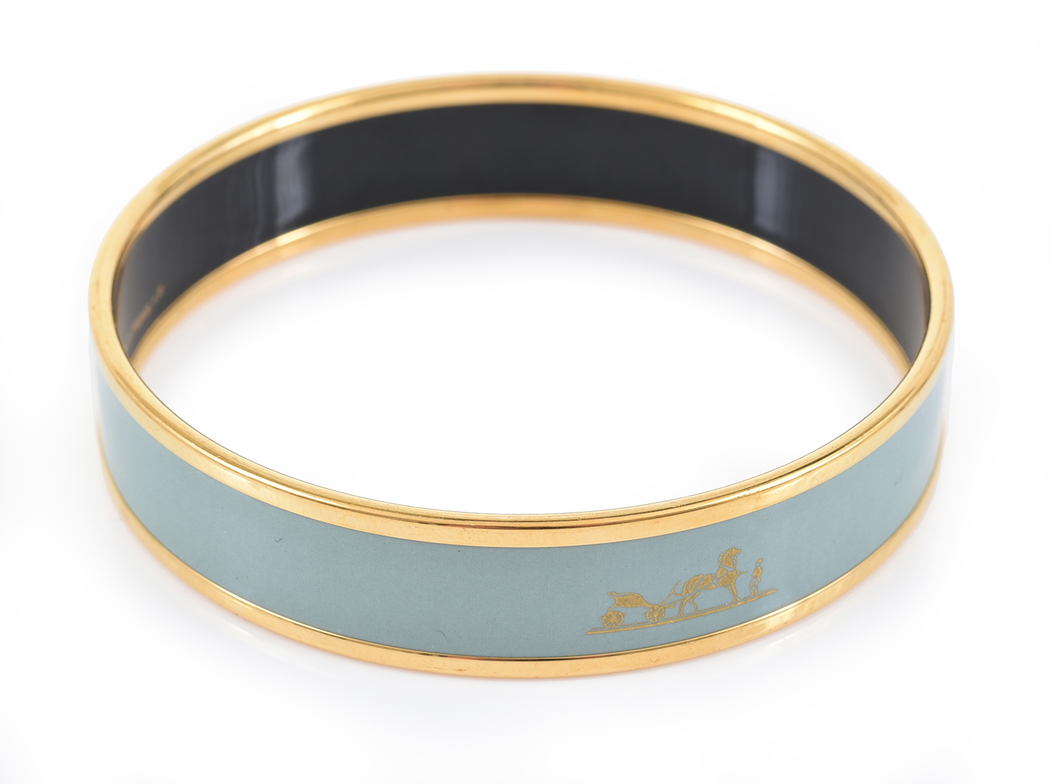 Styled in pale green enamel with gold horse and carriage pattern set in gold metal, 1.2cm wide, 6cm diameter.
