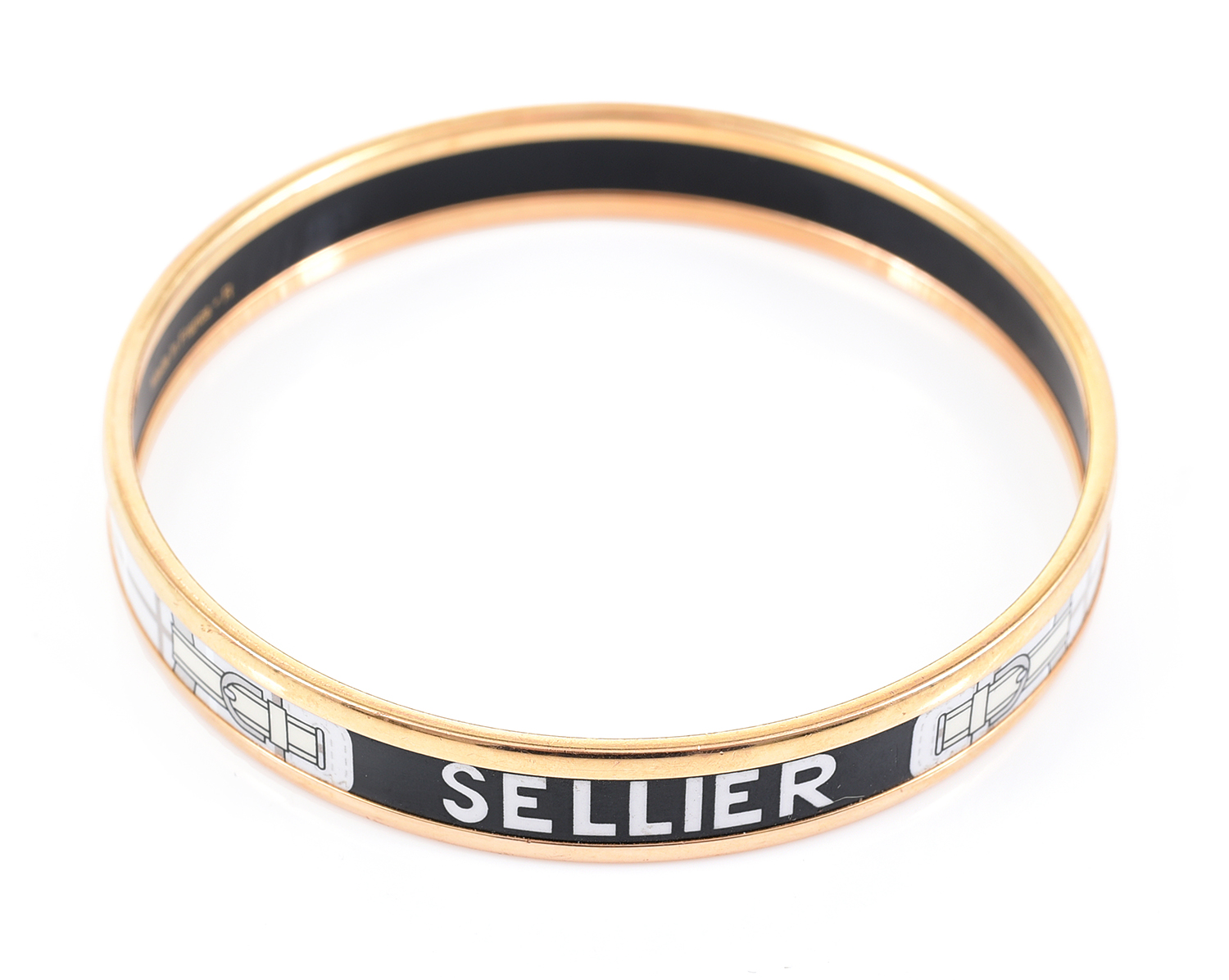 Styled in beige and black enamel with 'SELLIER' buckle design set in gold metal hardware, 8mm wide, 6cm diameter.