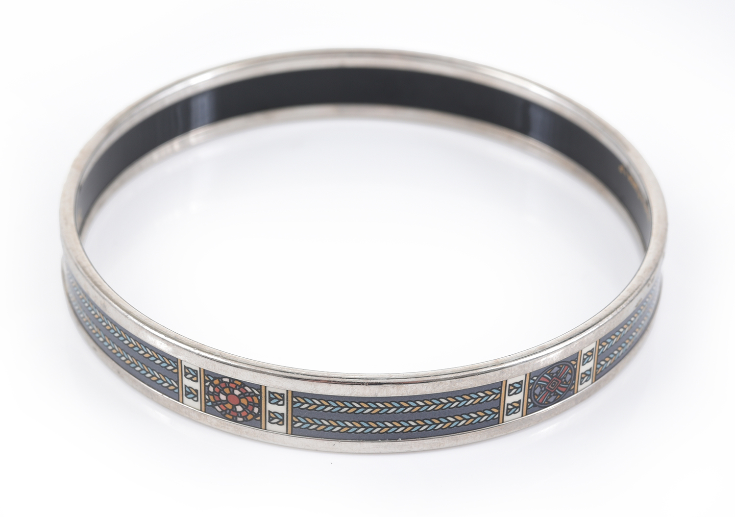 Styled with multicolour print on grey enamel, set in silver metal hardware, 8mm wide, 6.5cm diameter.