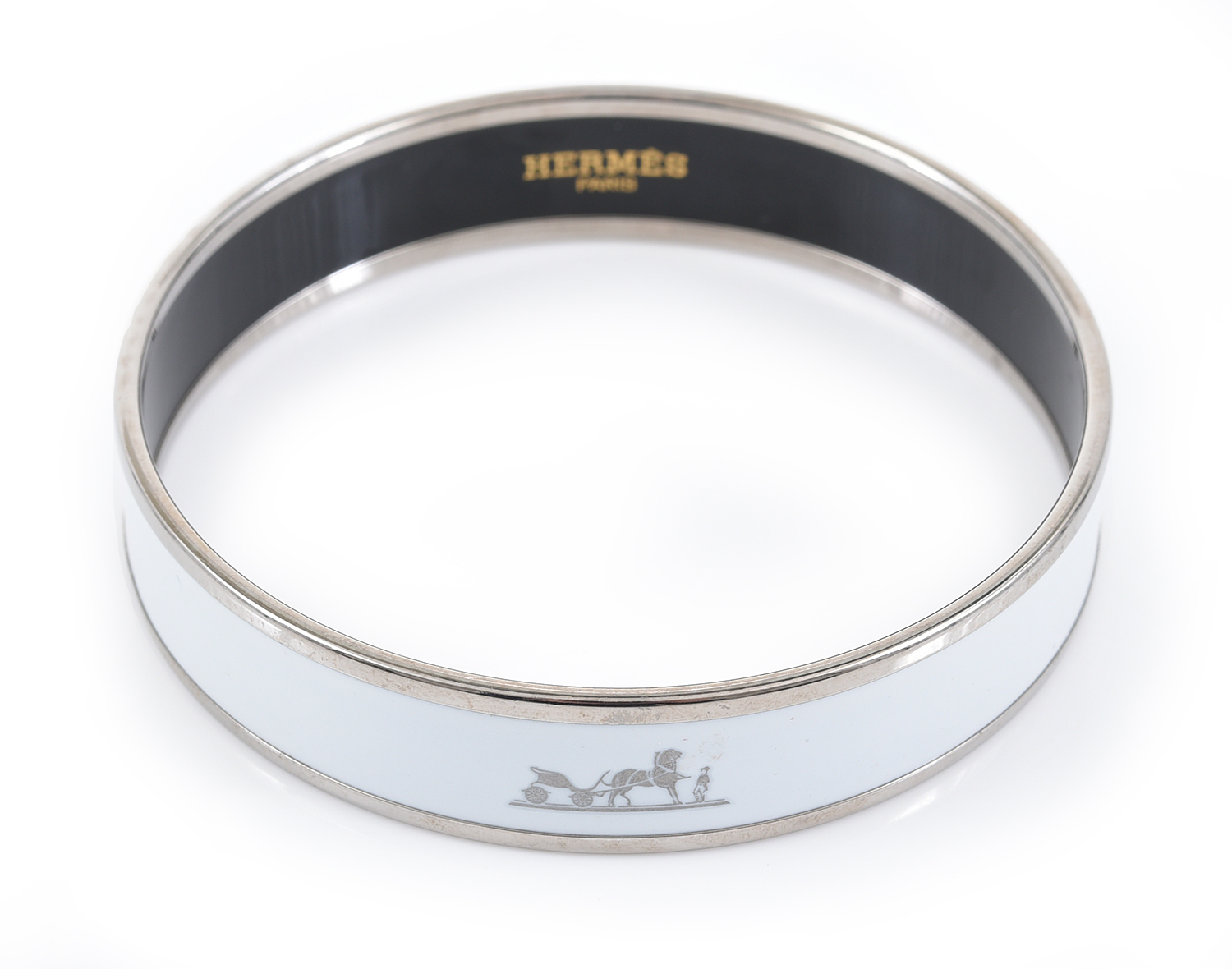 Styled in white enamel with silver horse and carriage pattern, set in silver metal, 1.2cm wide, 6.5cm diameter.