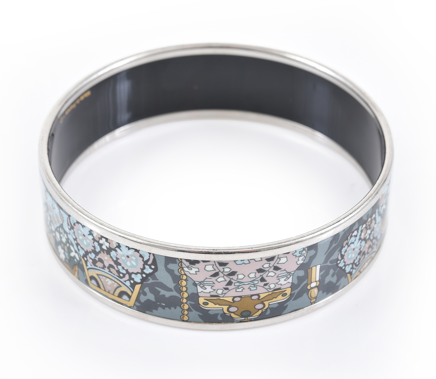 Styled in multicoloured pattern, set in silver metal, 1.8cm wide, 6.5cm diameter.