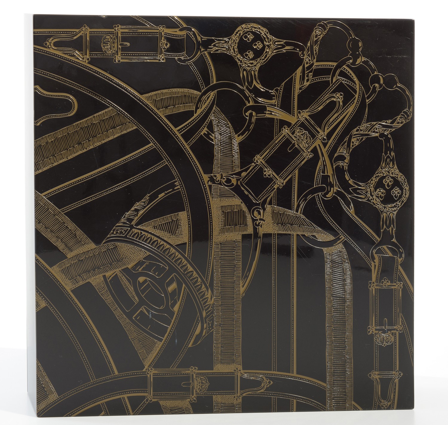 Styled in lacquered wood with embossed lid in 'Cavalcadour' print, 25cm square.