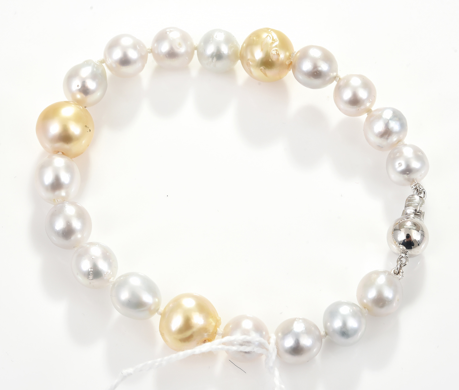 A GOLDEN AND WHITE SOUTH SEA PEARL BRACELET TO A SILVER CLASP
