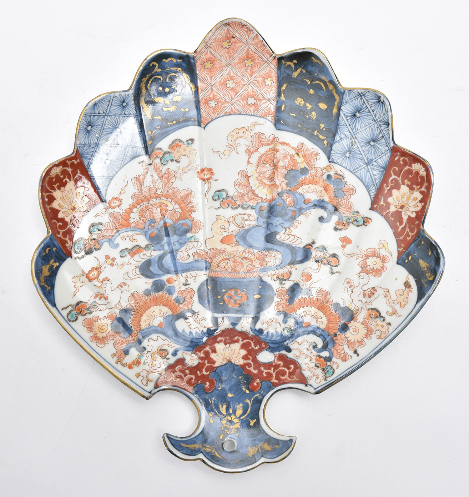Arita ware dish, in the form of a feathered fan, with brocade patterns, waves, flowers and birds in underglaze blue, polychrome enamels and gilding.