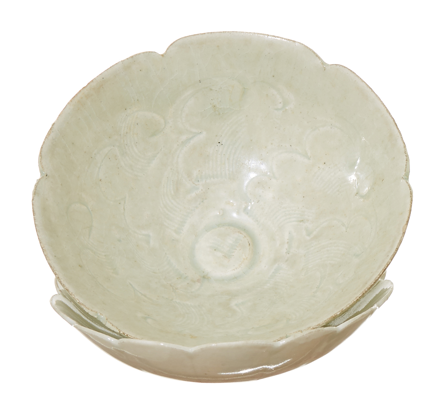Concial bowl with small chips to foot rim and mouth rim. The shallow bowl with one chip to the mouth rim.