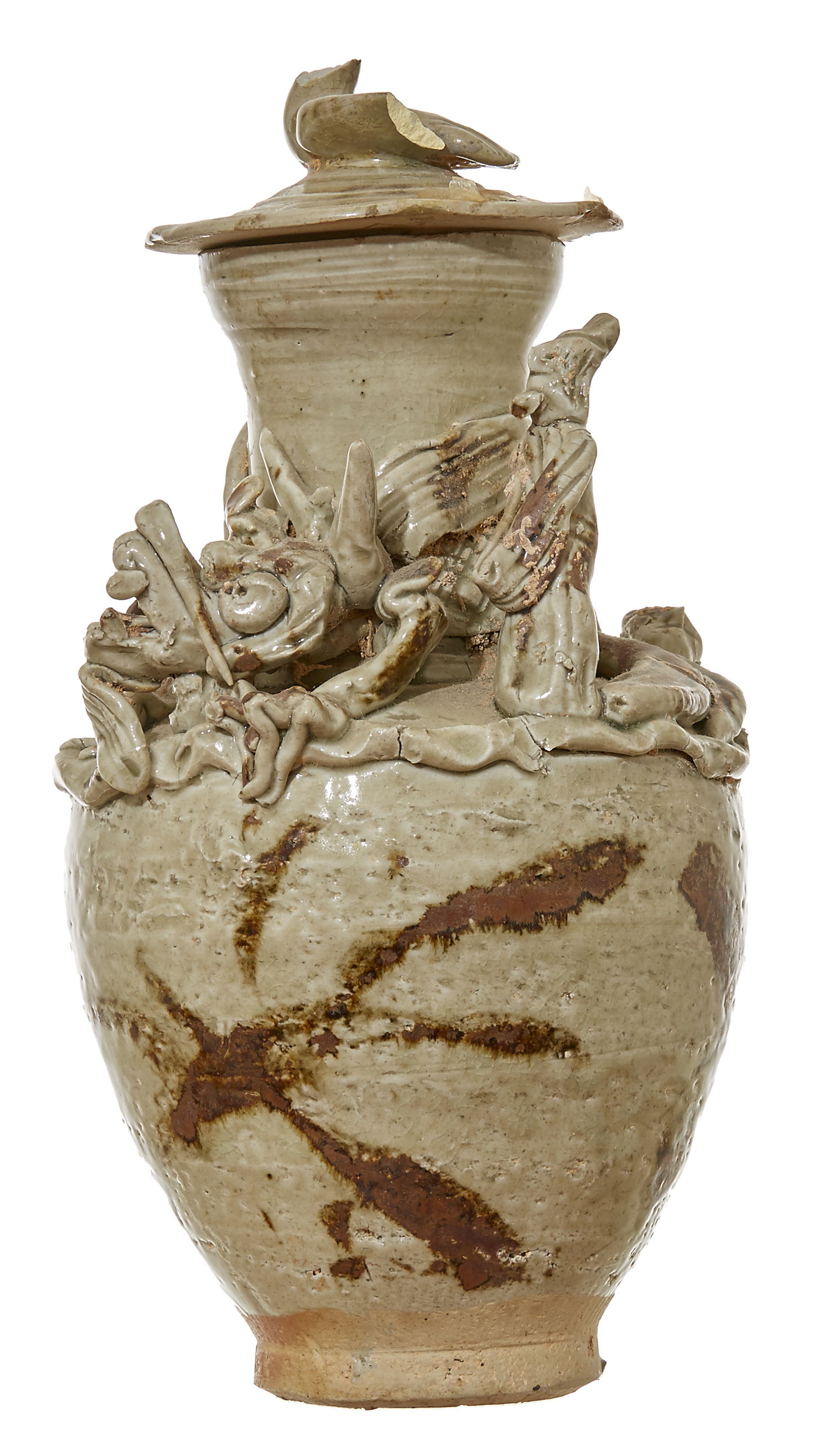 Decorated with an applique dragon and figure around the shoulder, the body with underglaze iron foliate designs.