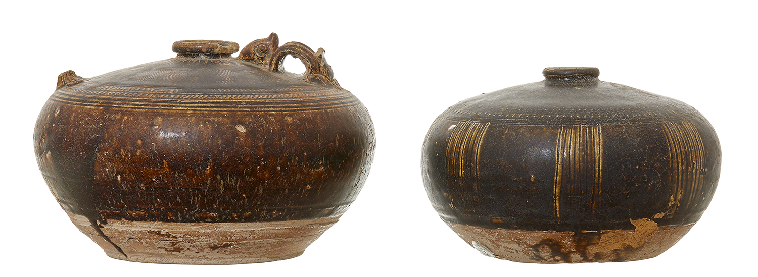 The two stoneware jars with incised geometric decoration under a deep brown glaze.