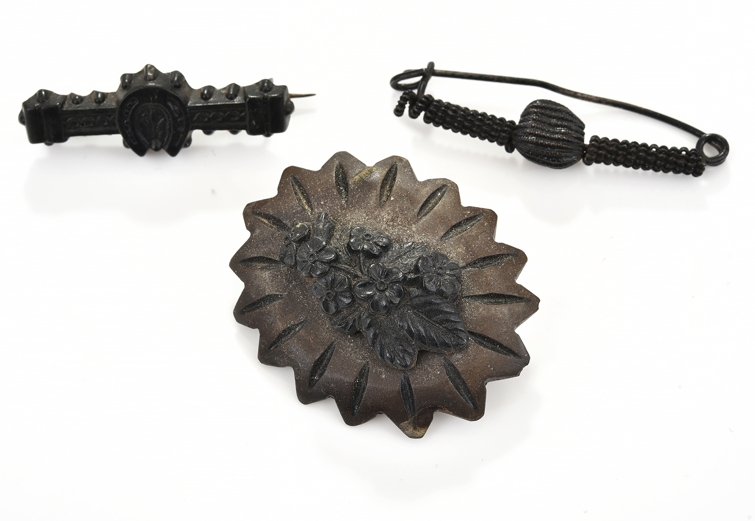A COLLECTION OF MOURNING BROOCHES IN BOG OAK AND METAL, A/F