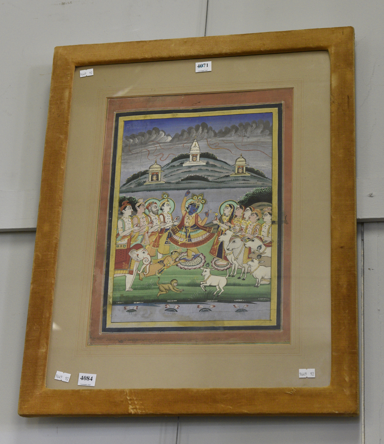 Krishna depicted in his form playing the flute, dancing on a lotus blossom, being worshipped by people and animals. Painted on paper.
