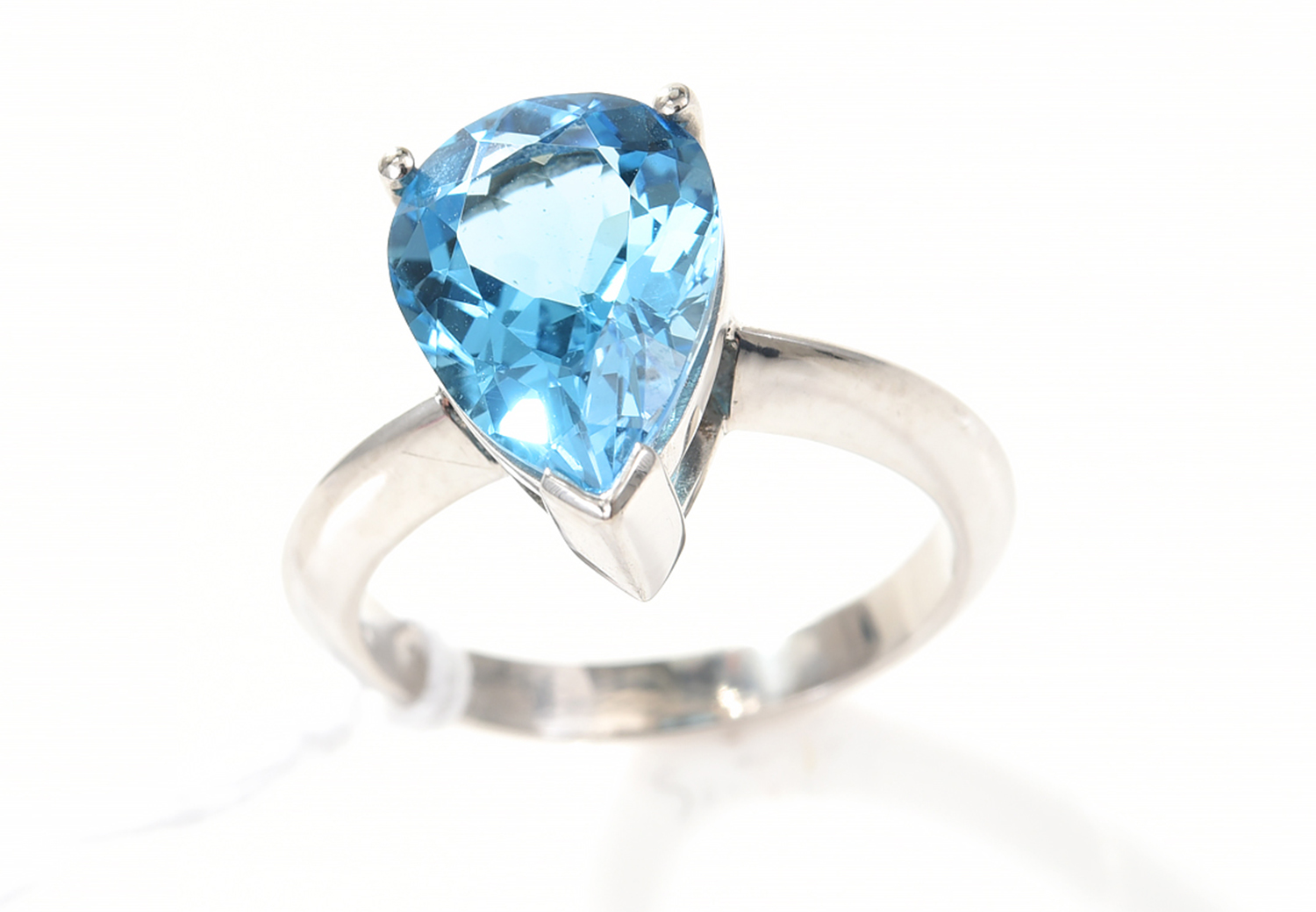 A PEAR BLUE TOPAZ SOLITAIRE RING IN 18CT WHITE GOLD.