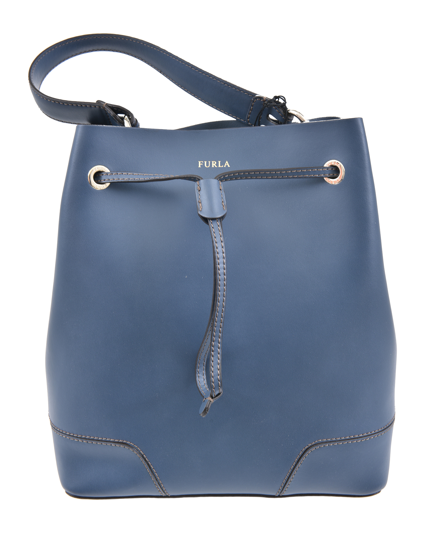 Styled in blue leather with contrast taupe stitching and silver metal hardware, 31 x 28 x 10cm.