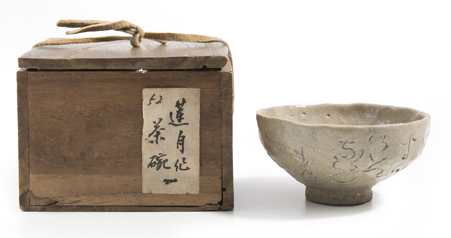 Coil formed stoneware teabowl with a high foot, with an incised inscription of a waka poem to the side, covered in a clear greyish tinged glaze, signed "Rengetsu". Together with an old Japanese wooden box.