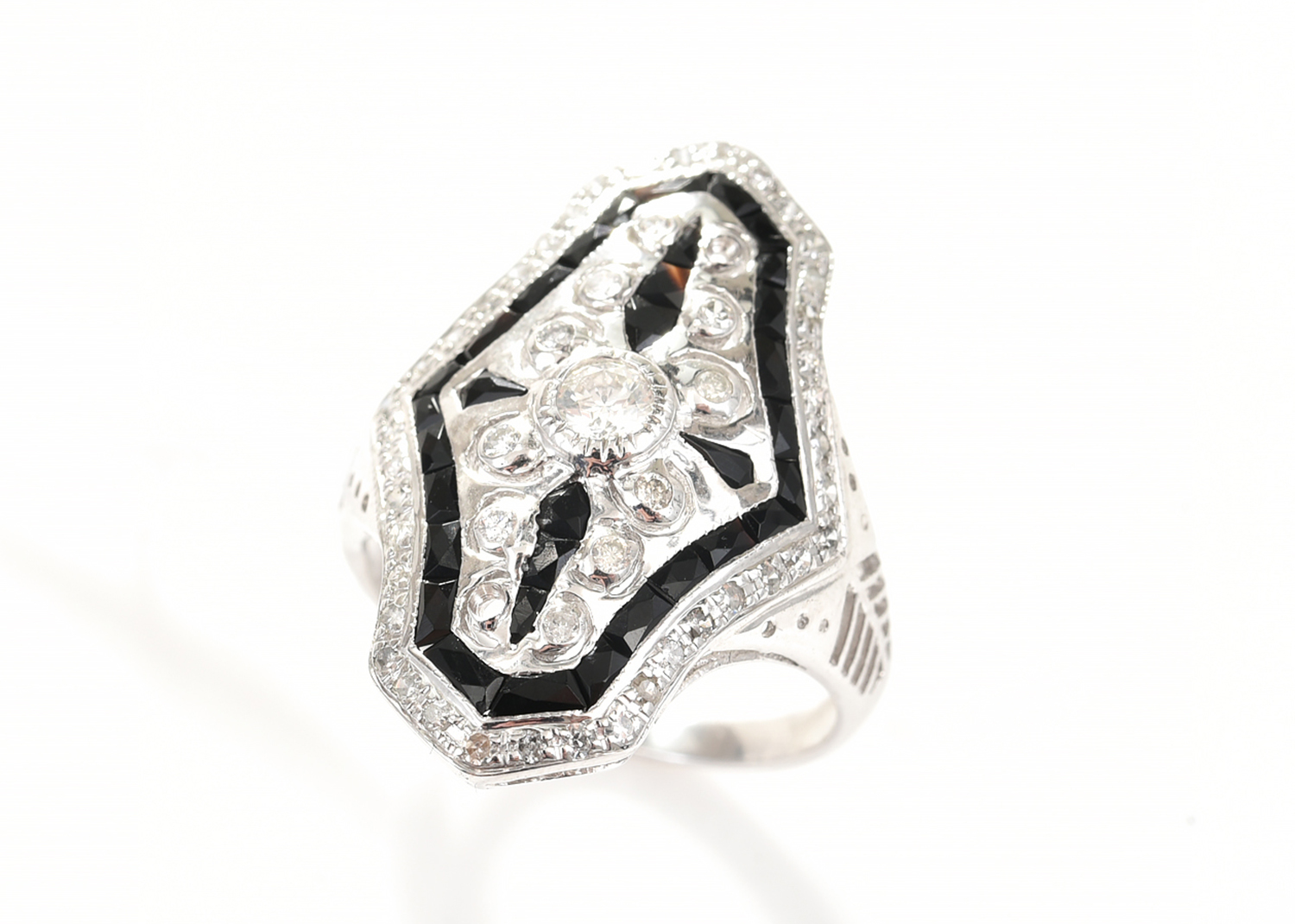 A DIAMOND AND BLACK ENAMEL CLUSTER RING IN SILVER.