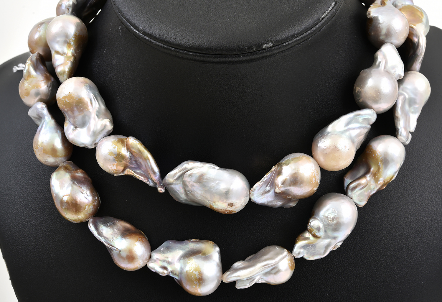 A BAROQUE PEARL NECKLACE, WITH MAGNETIC SILVER BALL CLASP.