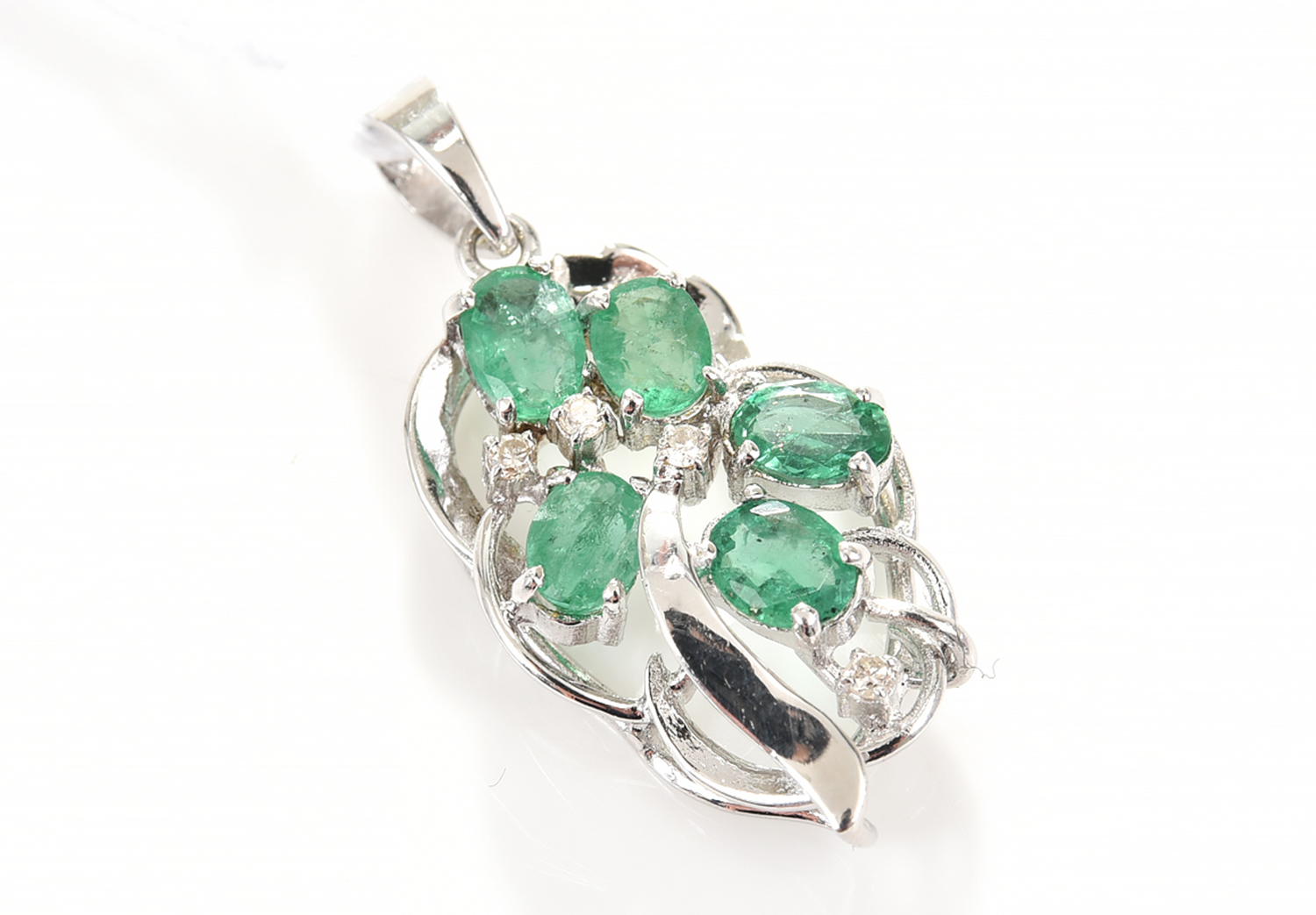 AN EMERALD AND DIAMOND CLUSTER PENDANT IN 18CT WHITE GOLD.