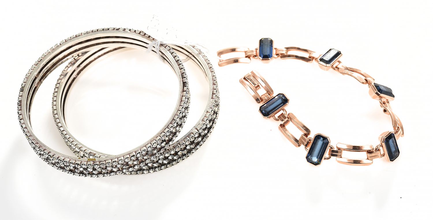 A PAIR OF COSTUME BANGLES AND A PASTE SET VINTAGE BRACELET