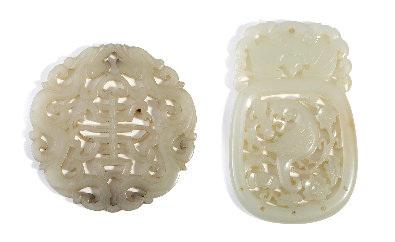 Both pendants of even celadon tone jade, one carved with a parrot amidst flowers and foliage, within a cartouche, beneath a bat, the other with two opposing qilong framing a stylised "shou" character.