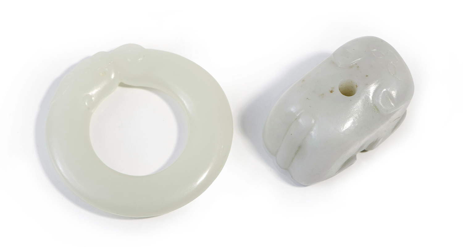 The dragon "bi" simply carved in the form of a dragon chasing its tail forming a circle, of pale celadon hue, together with a pale greyish celadon coloured cat-form toggle.