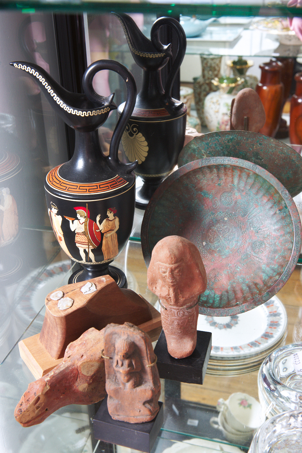 A SMALL GROUP INCLUDING THREE SMALL ANTIQUITIES, A REPRODUCTION RED ON BLACK VASE, AN ISLAMIC FOOTED BOWL