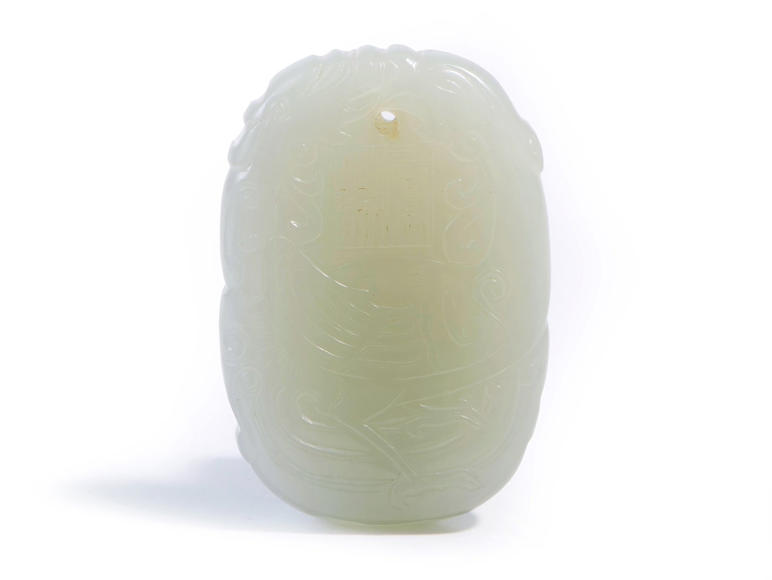 The jade of pale celadon hue, of even tone, carved in the form of a tablet, to one side with an archaistic dragon and the other an archaistic phoenix.