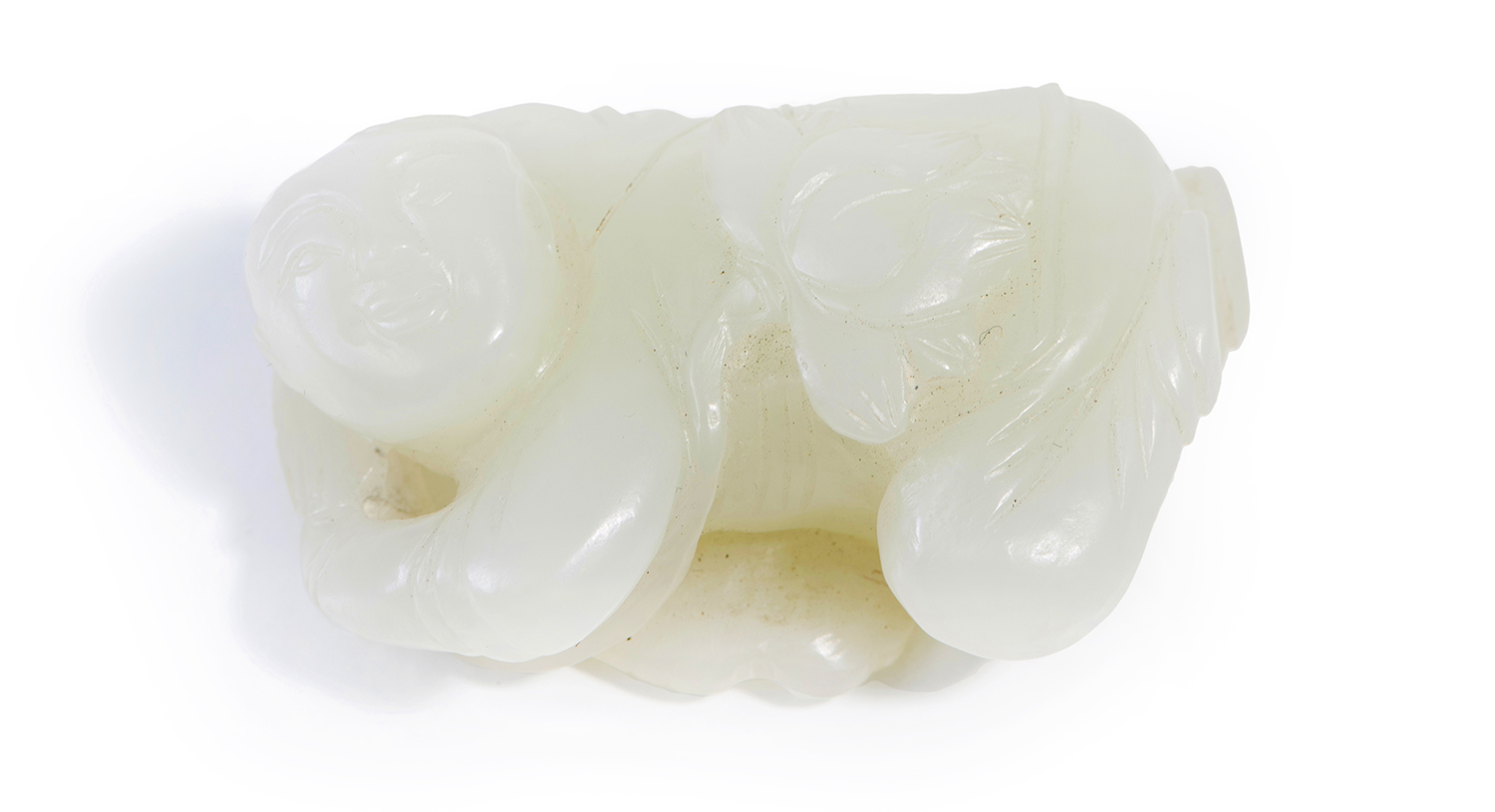 The jade of fine pale celadon hue of even tone, modelled as a recumbent boy holding a lotus leaf and flower.