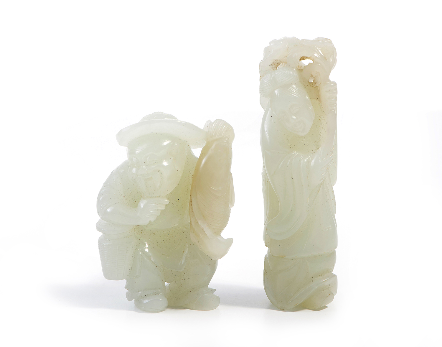 Both figures of pale celadon hue, one of an old man holding a fish, the other of a lady holding a branch.