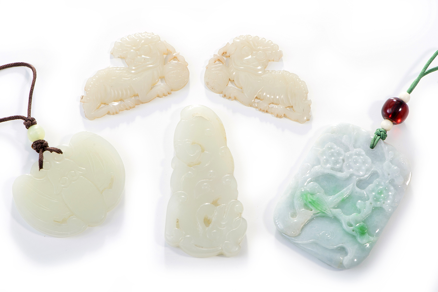 One pendant of nephrite with apple green inclusions, another in bat form, one in the form of an archaistic beast, and a pair of plaques in the form of shishi.