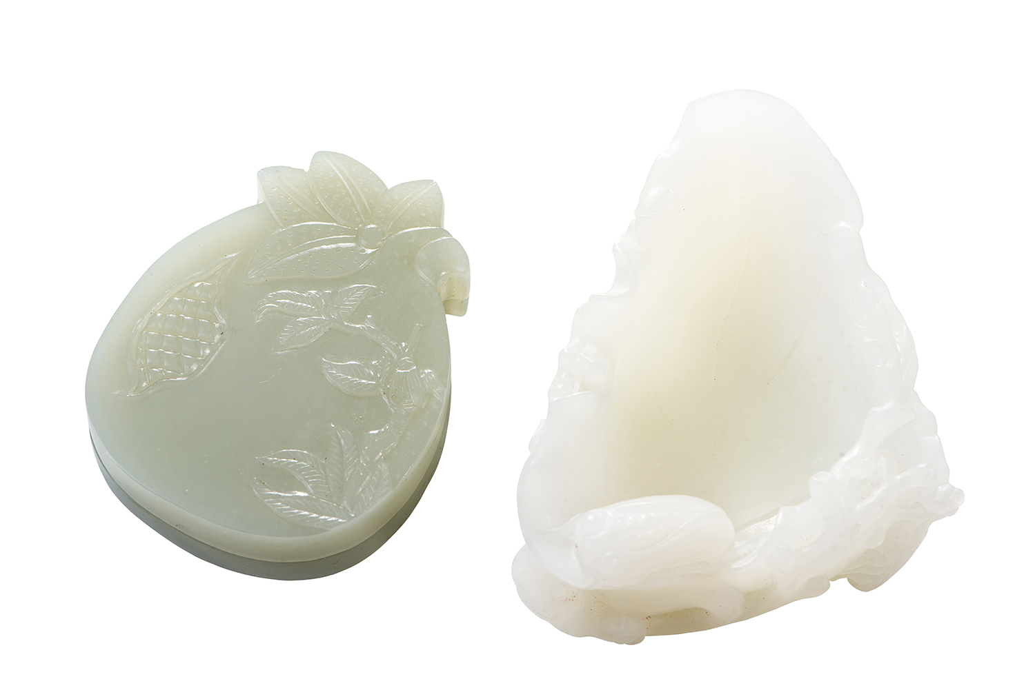 The box of a mid tone celadon green hue, carved in the form of a pomegranate with foliage, the brushwasher of white hue, carved in the form of a curled leaf, with a cicada resting on the edge.