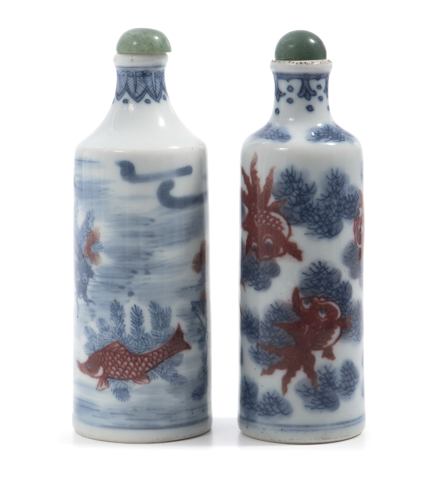 One very finely decorated with different species of fish swimming within a pond with water-weeds, the other decorated with goldfish swimming in a pond. Modern aventurine stoppers to each.