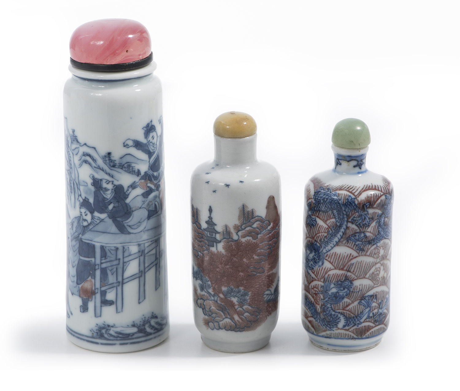 Three porcelain snuff bottles, each decorated in copper-red and underglaze-blue, two with figures in landscapes and one with dragons amidst waves. Each with a modern hardstone stopper.