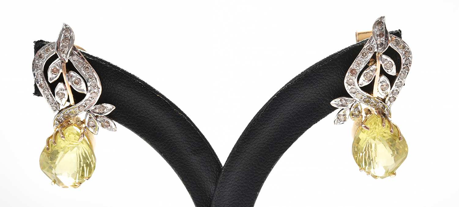 A PAIR OF GREEN QUARTZ AND DIAMOND EARRINGS IN 14CT GOLD