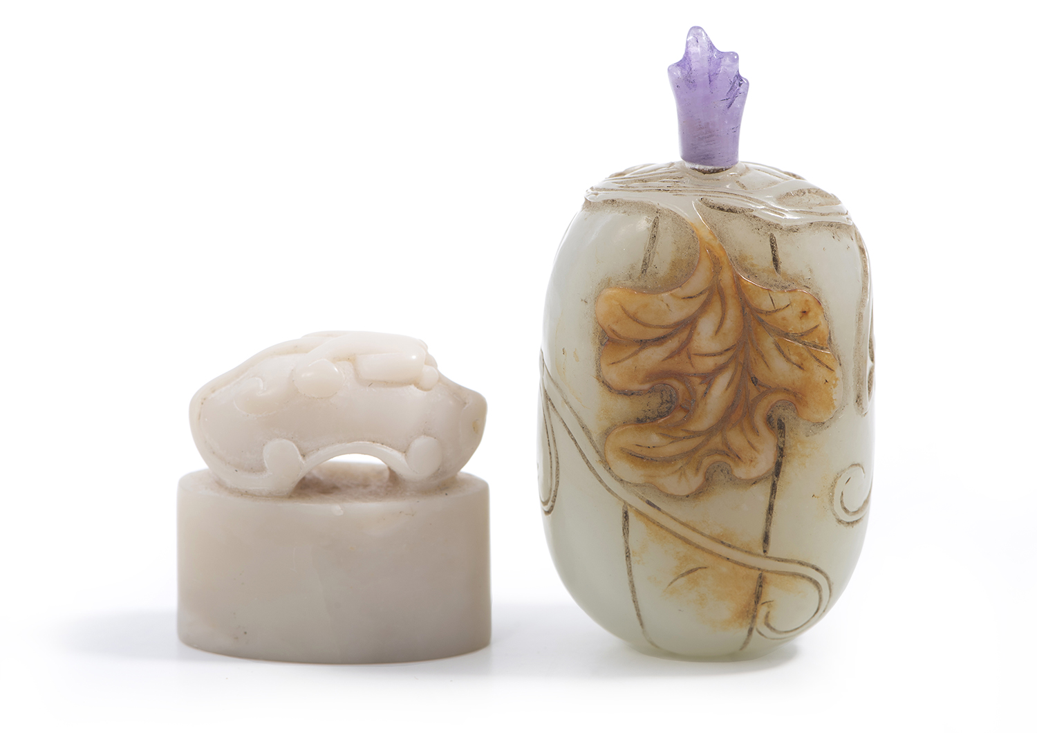 The snuff bottle of melon form, with an amethyst stopper. The hardstone seal with an archaistic dragon knob.