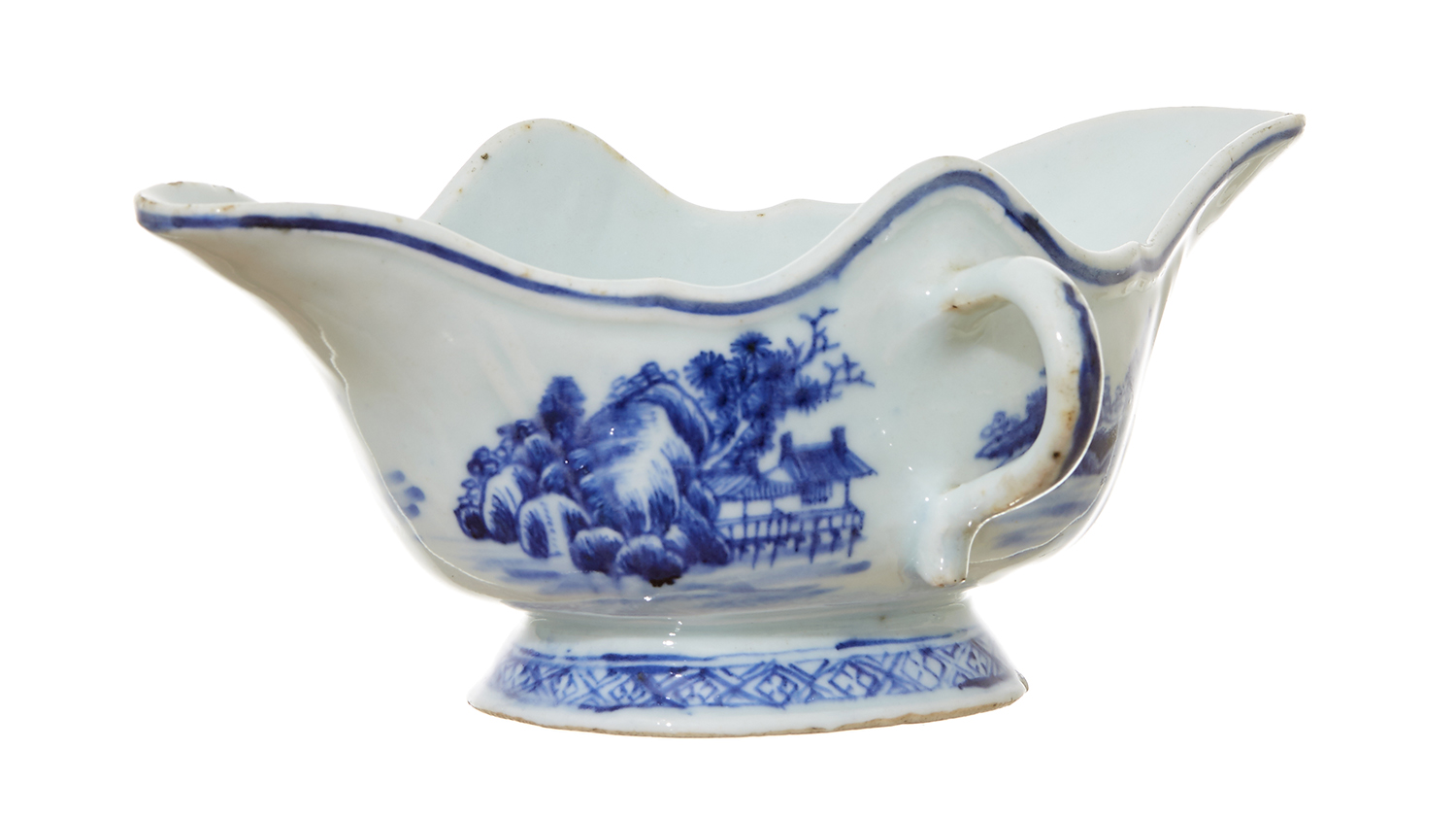 The side-handled sauce boat finely decorated with a landscape to the side and a diaper pattern border above the foot.