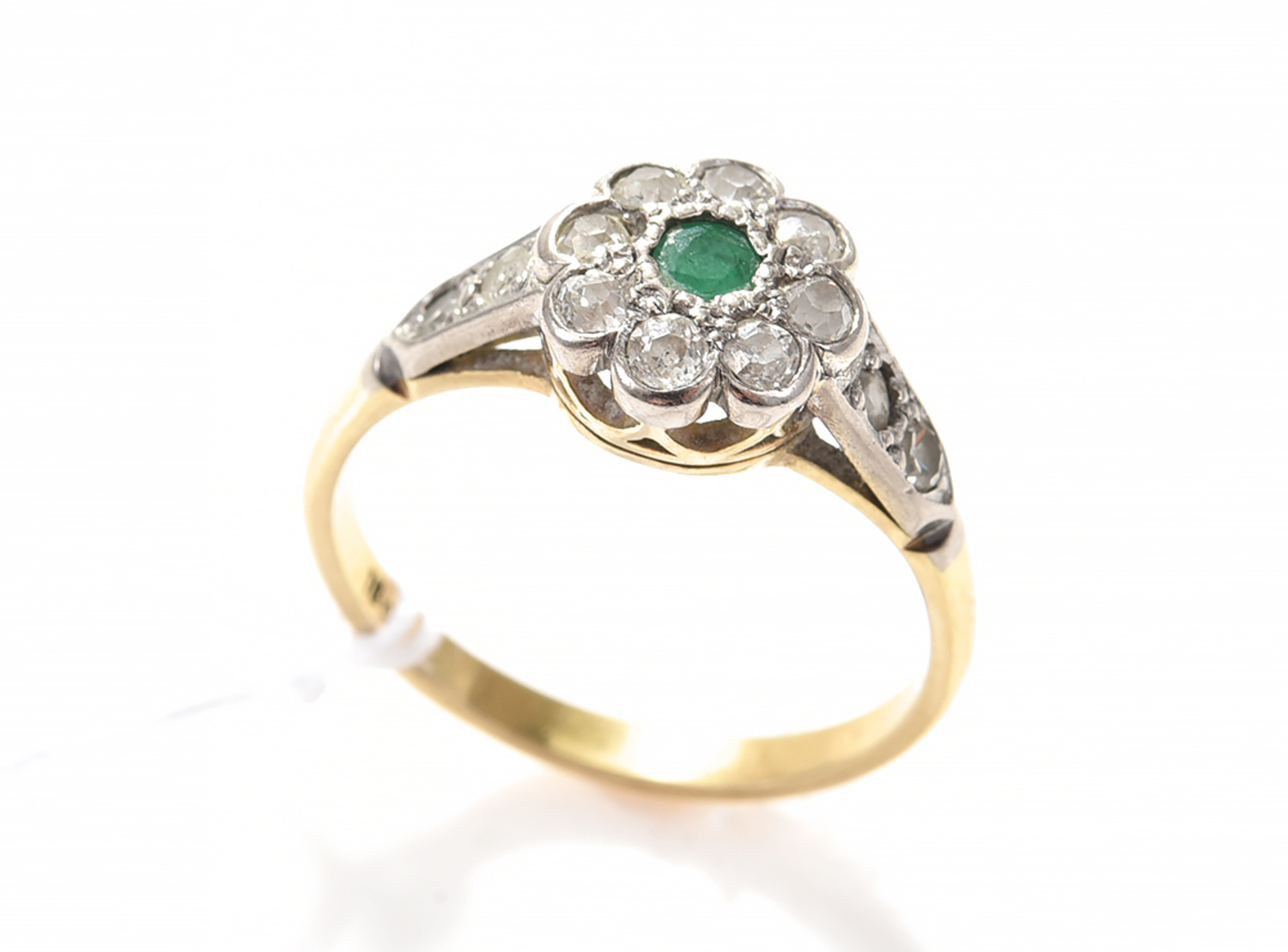 AN EMERALD AND DIAMOND CLUSTER RING IN 18CT GOLD