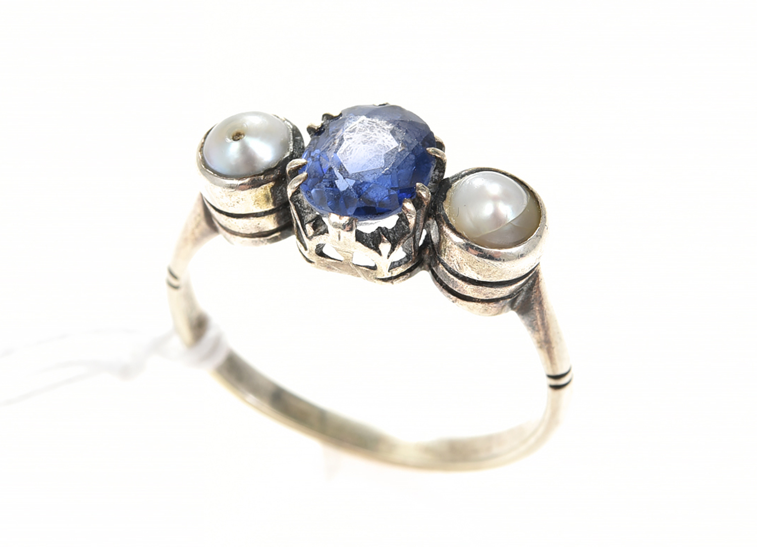 A CEYLON SAPPHIRE AND SPLIT PEARL RING IN 9CT WHITE GOLD, RING SIZE G.