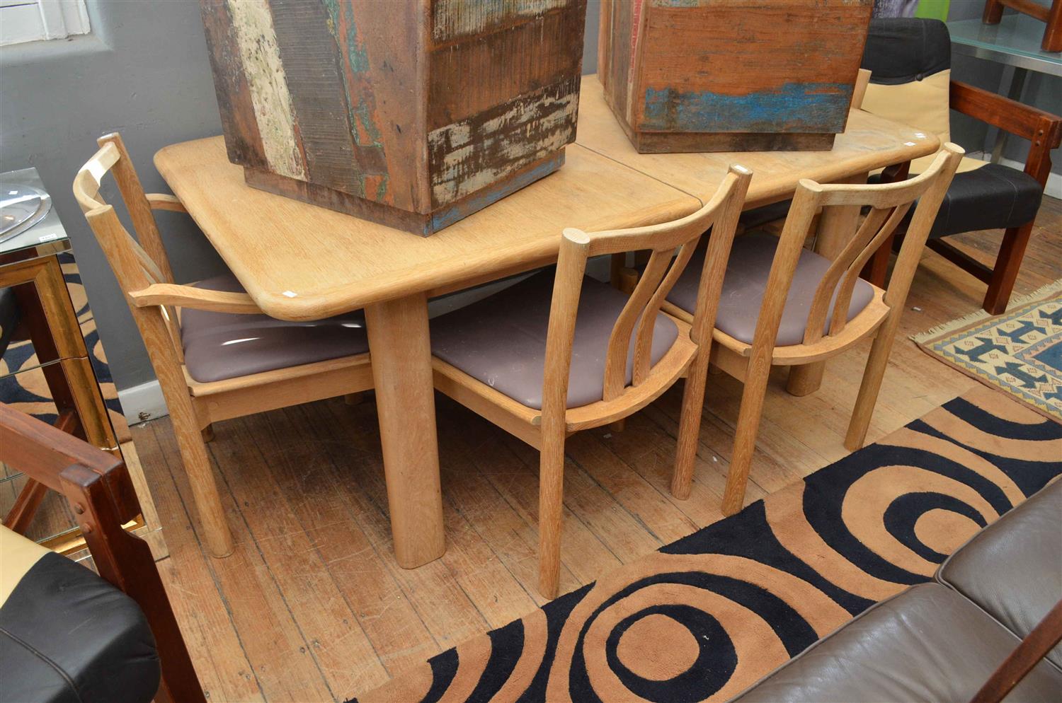 A CONTEMPORARY AUSTRALIAN MADE OAK DINING SETTING, DESIGNED BY CHARLES CATT, WESTERN AUSTRALIA (FAULTS TO LEG OF TABLE)