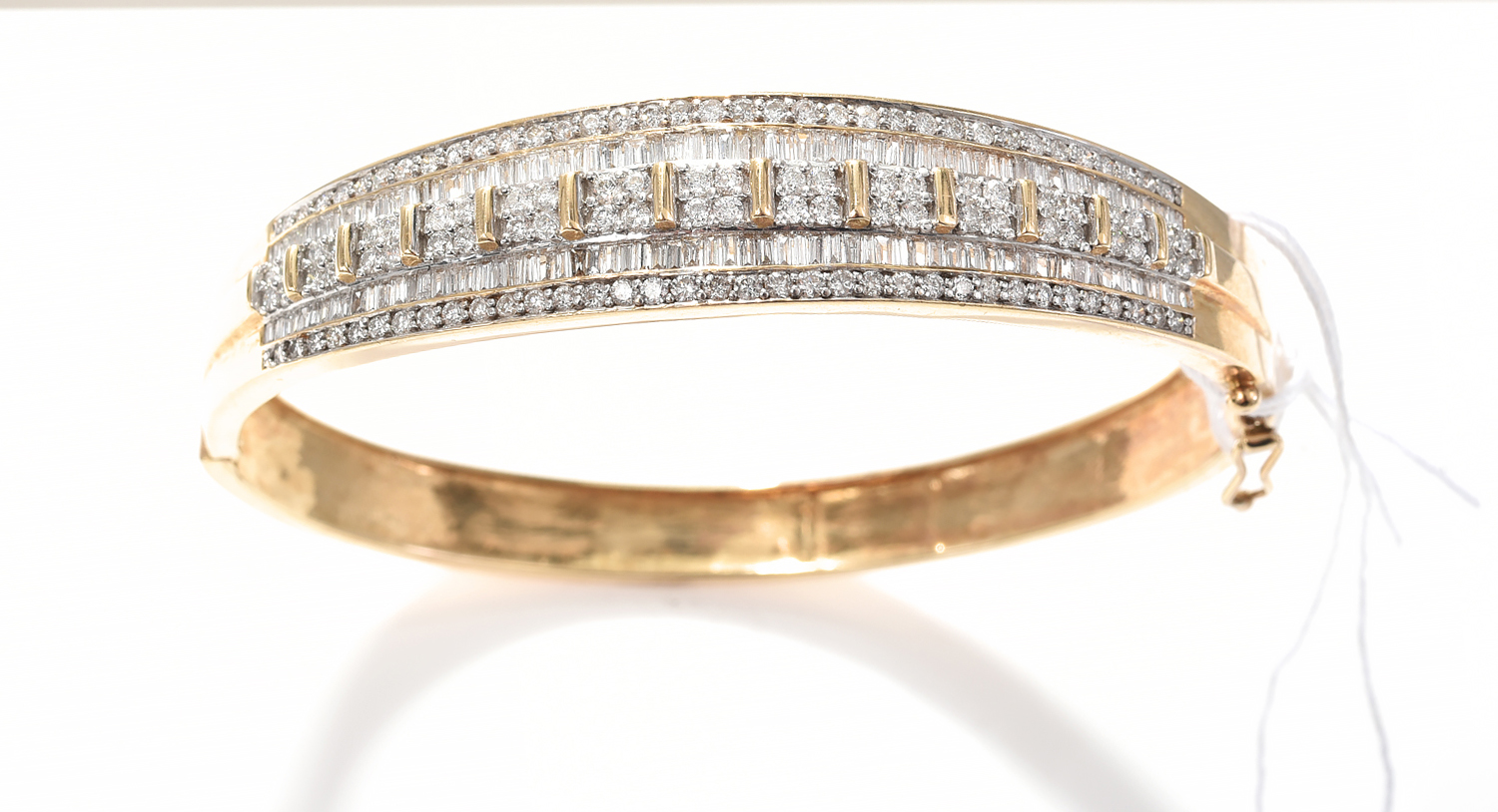 A DIAMOND BANGLE IN 14CT GOLD, DIAMONDS TOTALLING APPROXIMATELY 2.40CTS