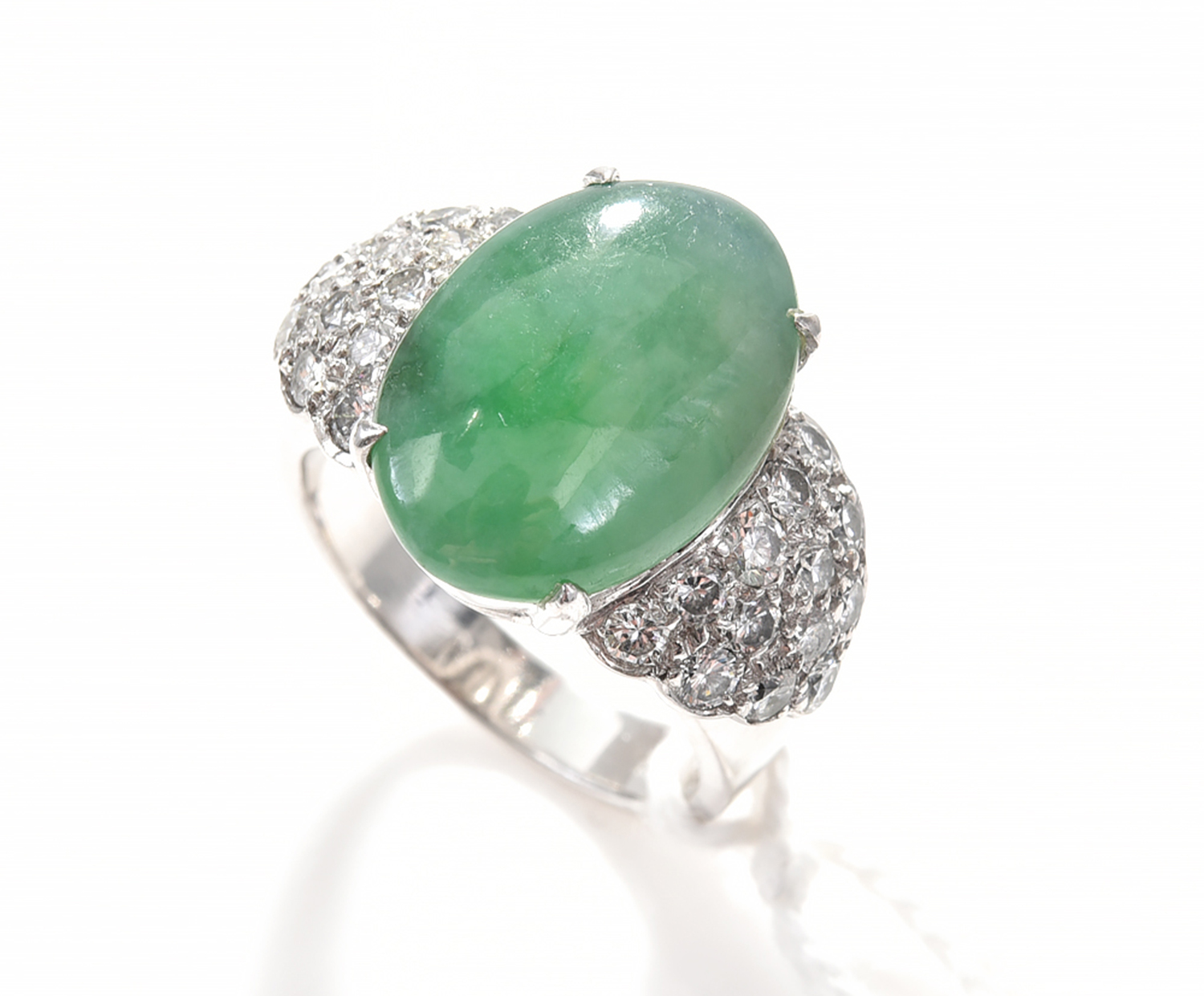 A JADE AND DIAMOND RING IN 14CT WHITE GOLD