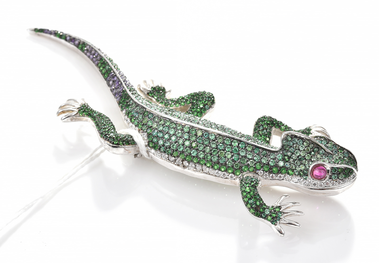 A GREEN CUBIC ZIRCONIA SET LIZARD BROOCH