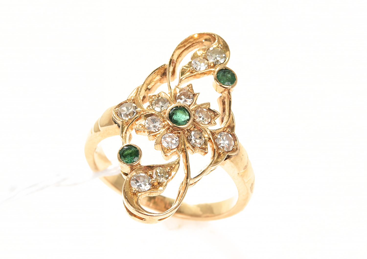 AN EMERALD AND DIAMOND PIERCED PLAQUE RING, MOUNTED IN 18CT GOLD.