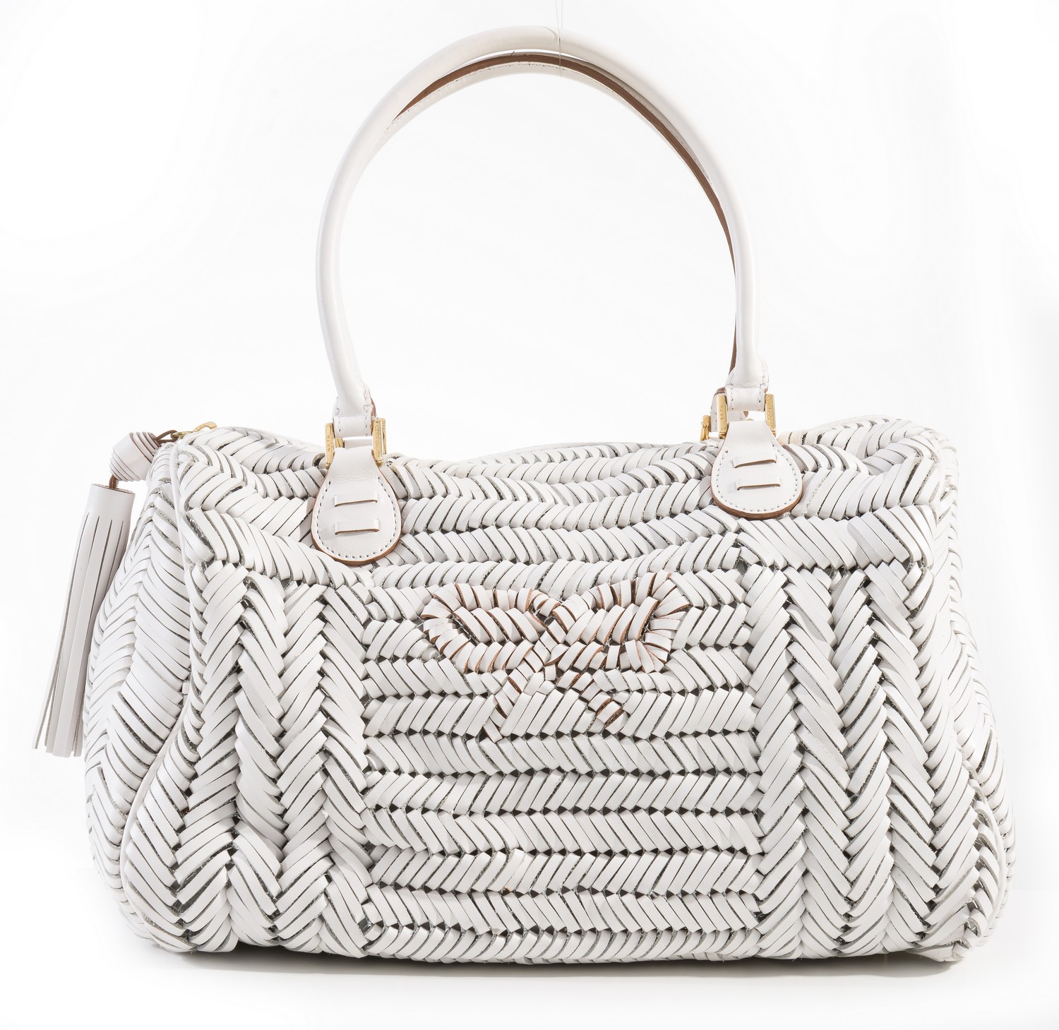 Styled in white woven leather with gold metal hardware, 25 x 32 x 20cm.