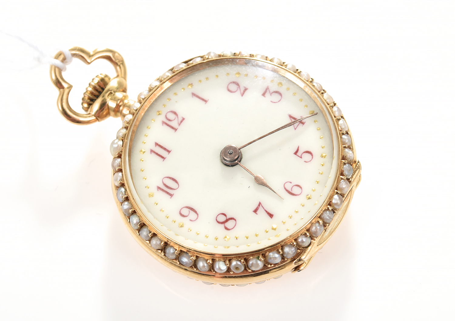 A SEED PEARL AND ENAMEL LADIES POCKETWATCH IN 18CT GOLD.