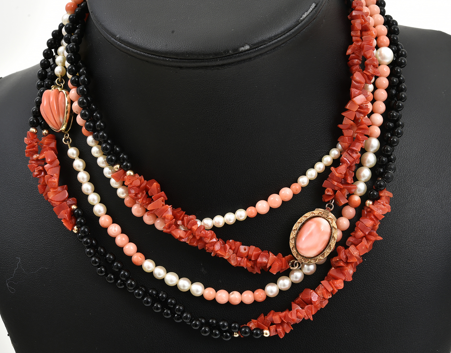 A CORAL AND PEARL NECKLACE TO A 14CT CLASP AND A CORAL AND ONYX NECKLACE