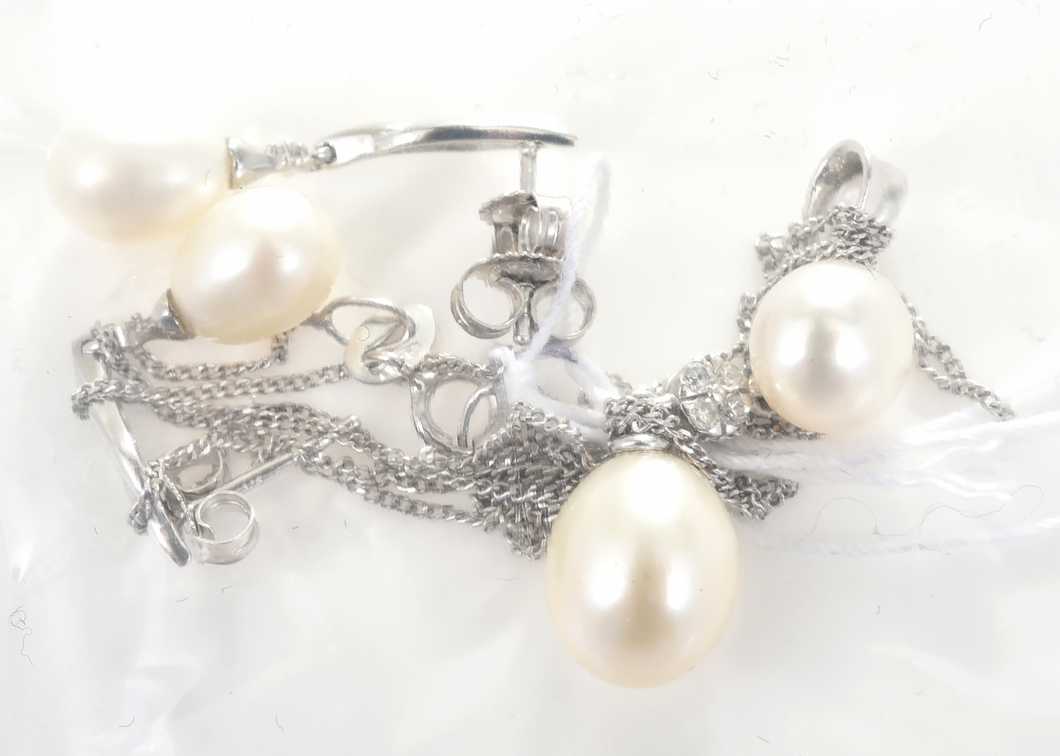 A SUITE OF CULTURED PEARL JEWELLERY, INCLUDING A PENDANT ON A FINE CHAIN AND A PAIR OF EARRINGS, ALL IN WHITE GOLD
