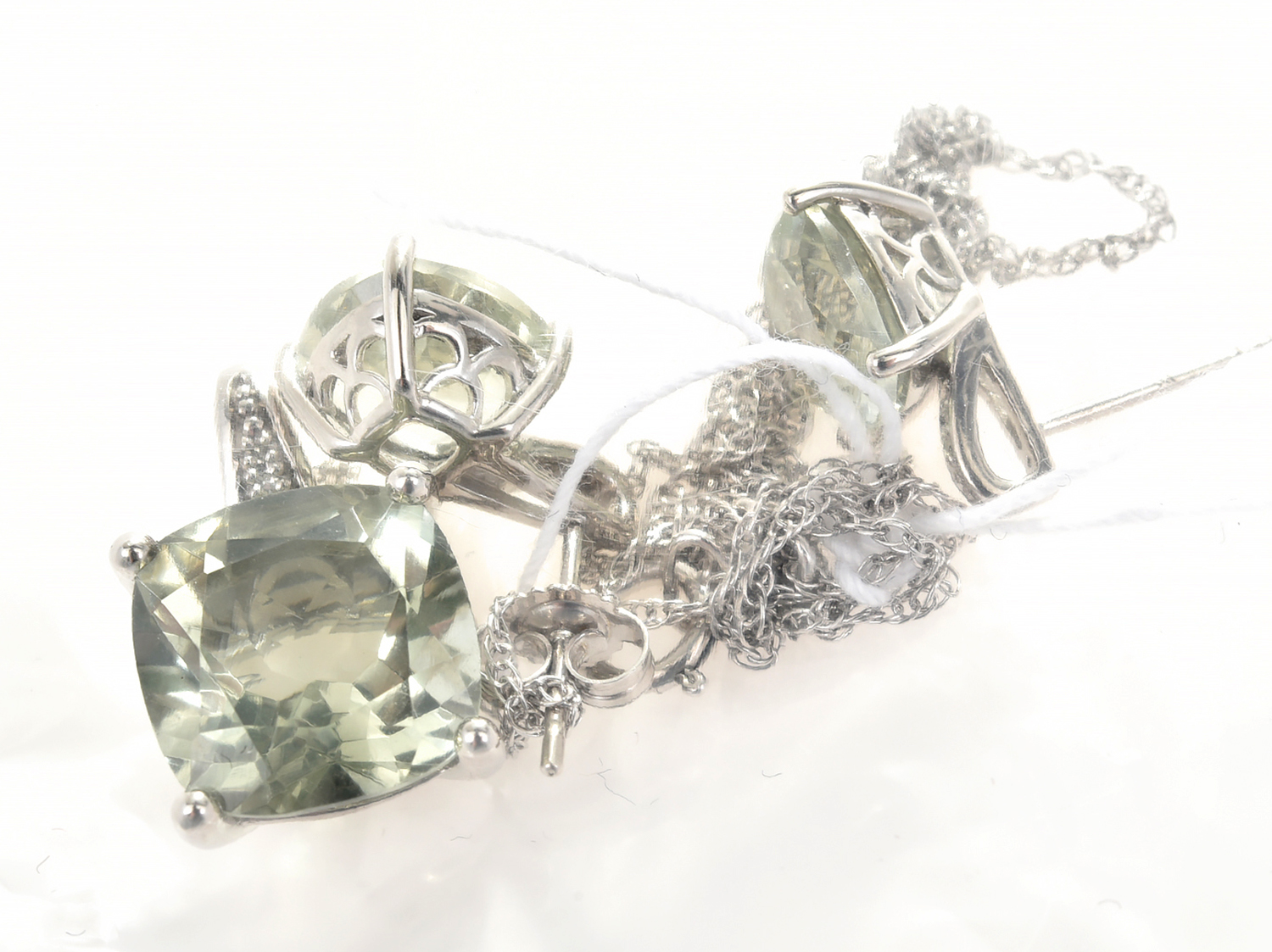 A SUITE OF PRASIOLITE AND DIAMOND JEWELLERY, INCLUDING A PENDANT ON A FINE CHAIN AND A PAIR OF EARRINGS, ALL IN WHITE GOLD