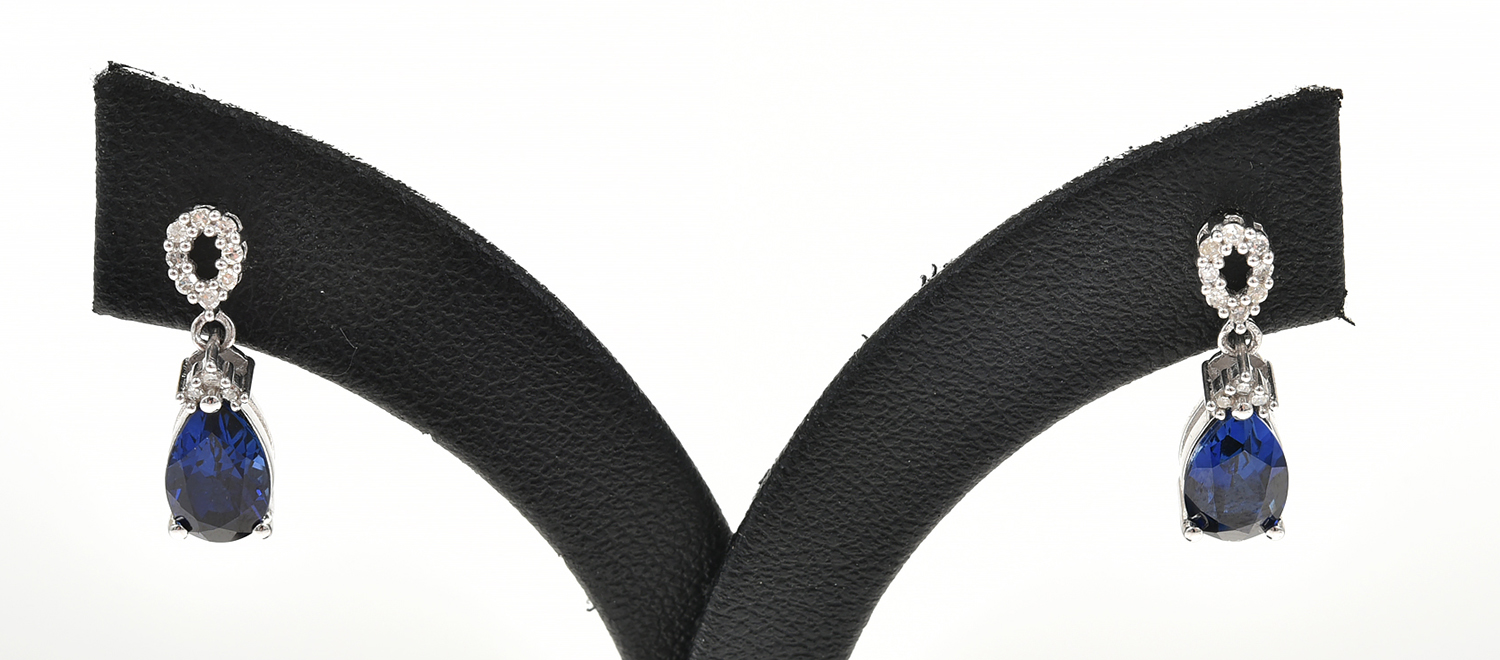 A PAIR OF SAPPHIRE AND DIAMOND DROP EARRINGS IN WHITE GOLD