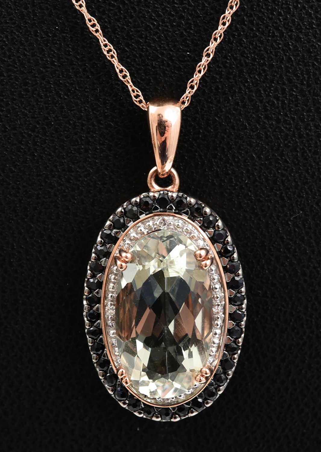 A PRASIOLITE, SAPPHIRE AND DIAMOND PENDANT TO A FINE TRACE CHAIN ALL IN ROSE GOLD