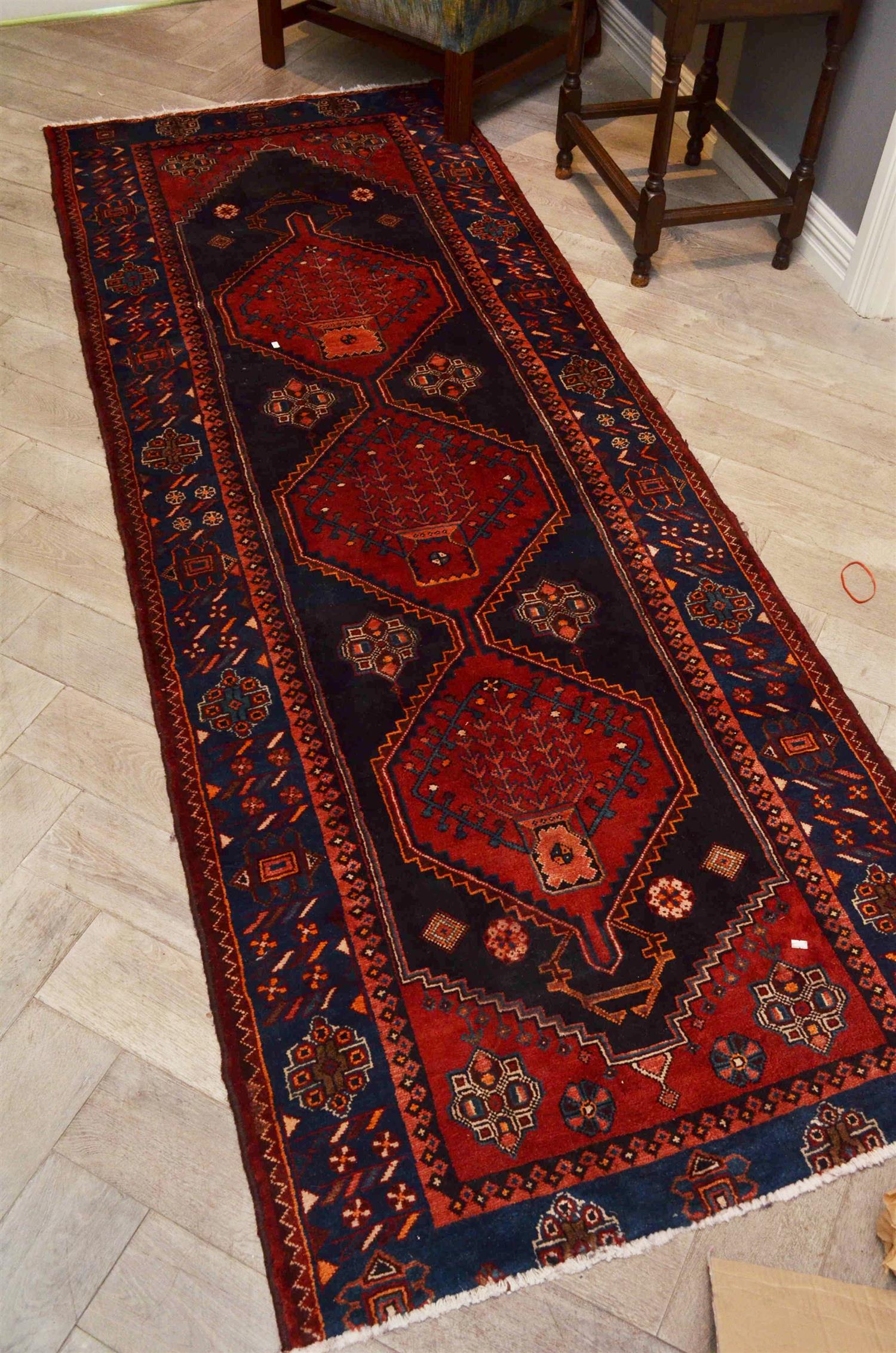 PERSIAN NOMADIC AZERBAIJAN HALL RUNNER IN GEOMETRICAL DIAMOND SHAPE MOTIFS, HAND KNOTTED IN IRAN WITH 100% WOOL PILE AND 100% NATURAL DYES, VERY HARD WEARING HALL RUNNER SIZE 3M X 1.1M RRP$2400