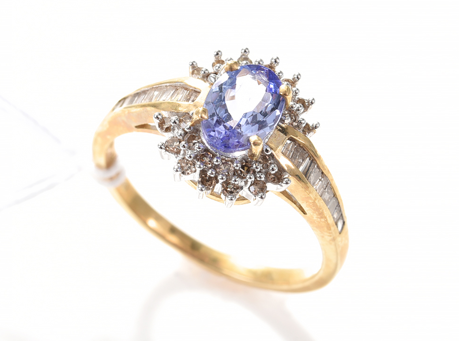 A TANZANITE AND DIAMOND CLUSTER RING IN 14CT GOLD.
